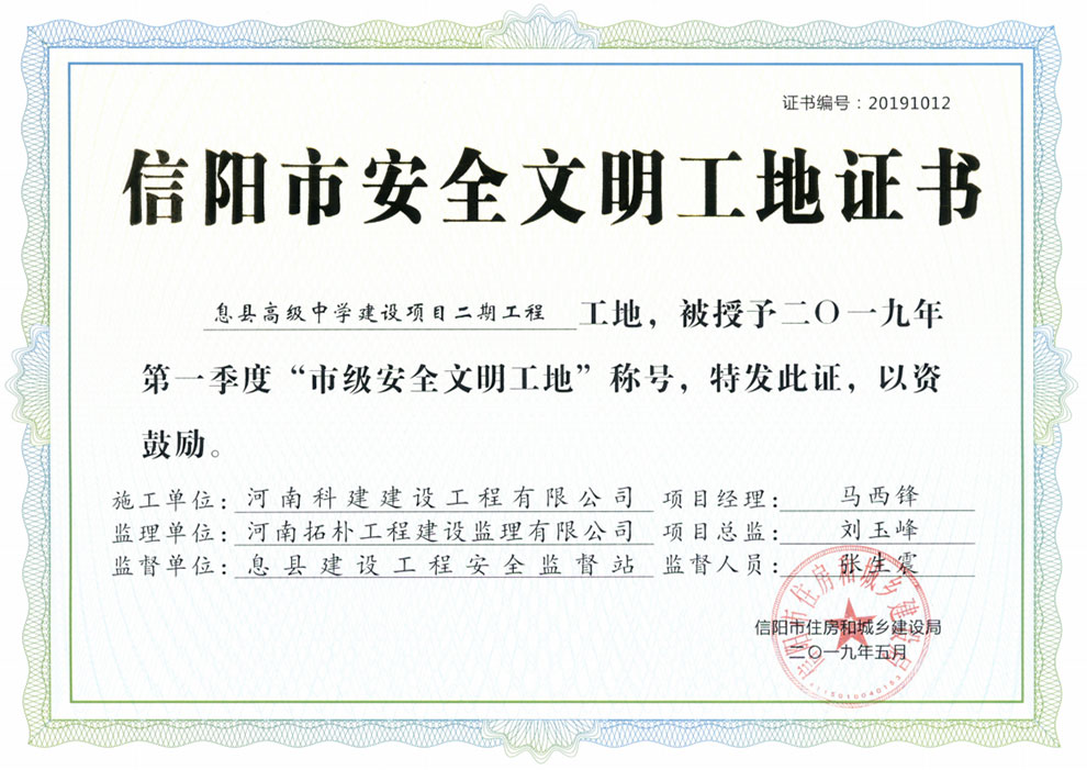 息县高级中学建设项目二期工程工地,被授予二零一九年第一季度“市级安全文明工地”称号